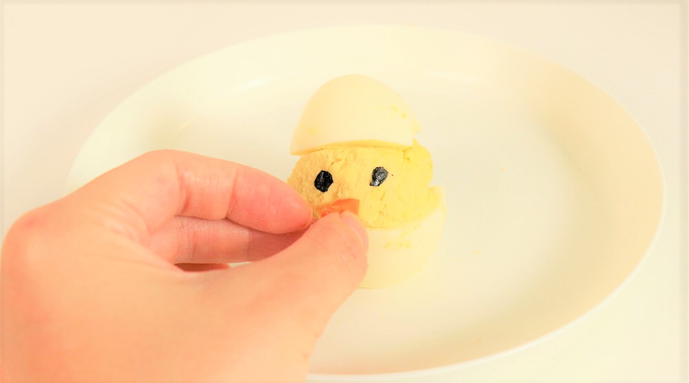 剪取小片海苔和紅蘿蔔黏上蛋黃表面。