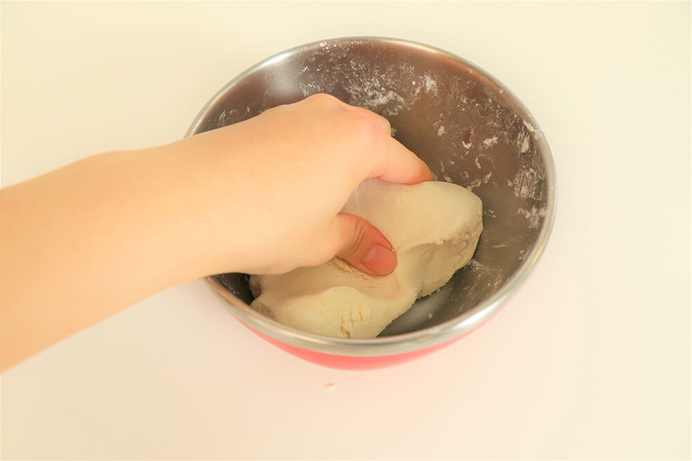 捏到粉糰光滑、盆子空空、手上沒有麵粉的狀態即可。