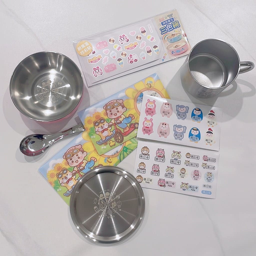 每個防水姓名貼、耐高溫姓名貼、不鏽鋼三色碗和客製化不鏽鋼杯,