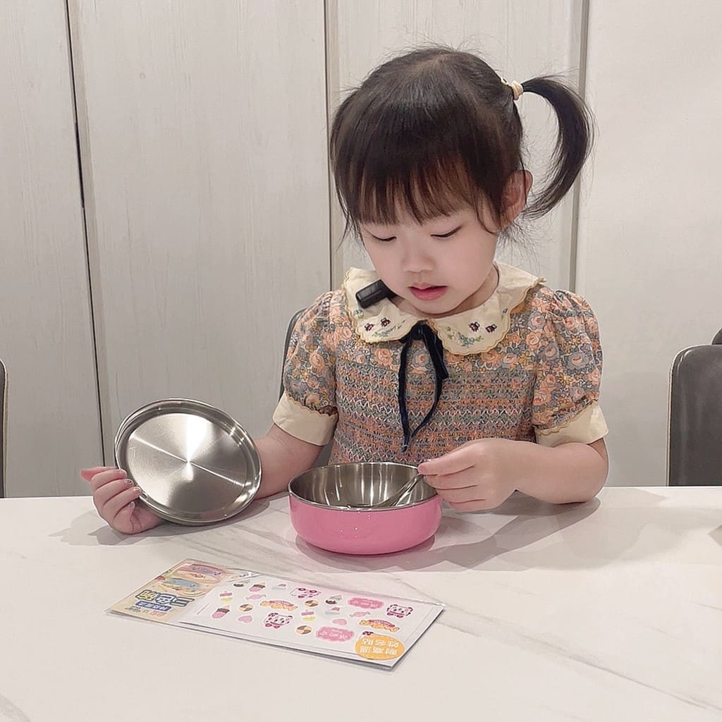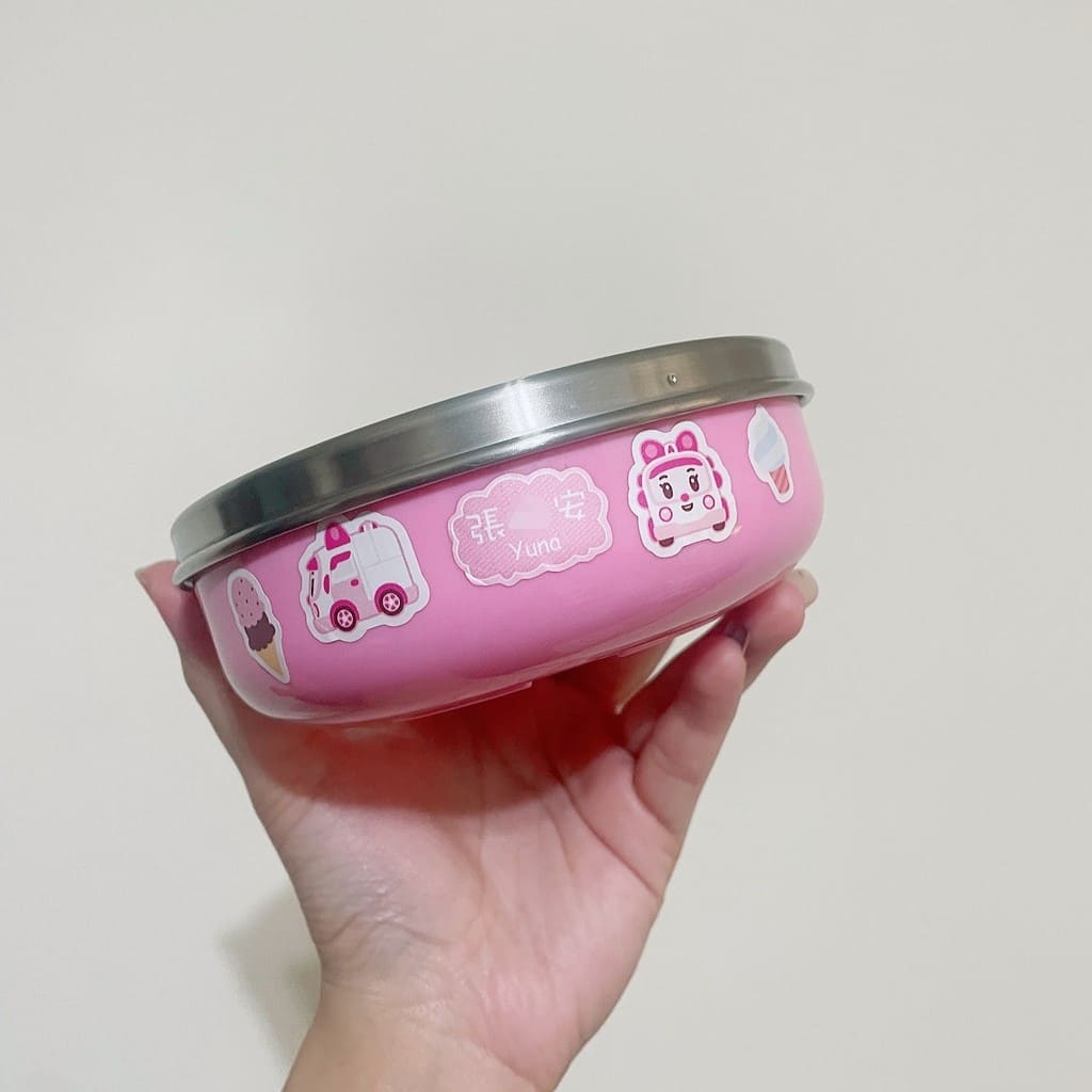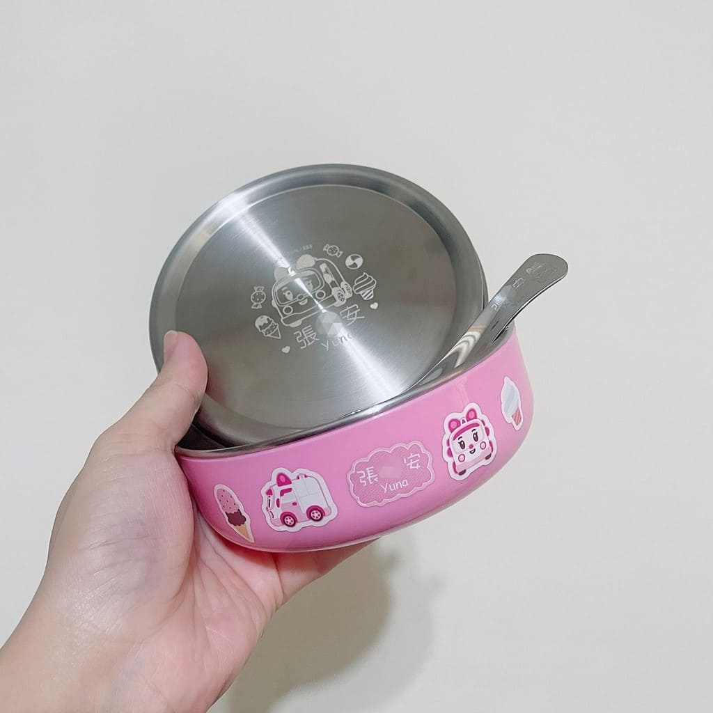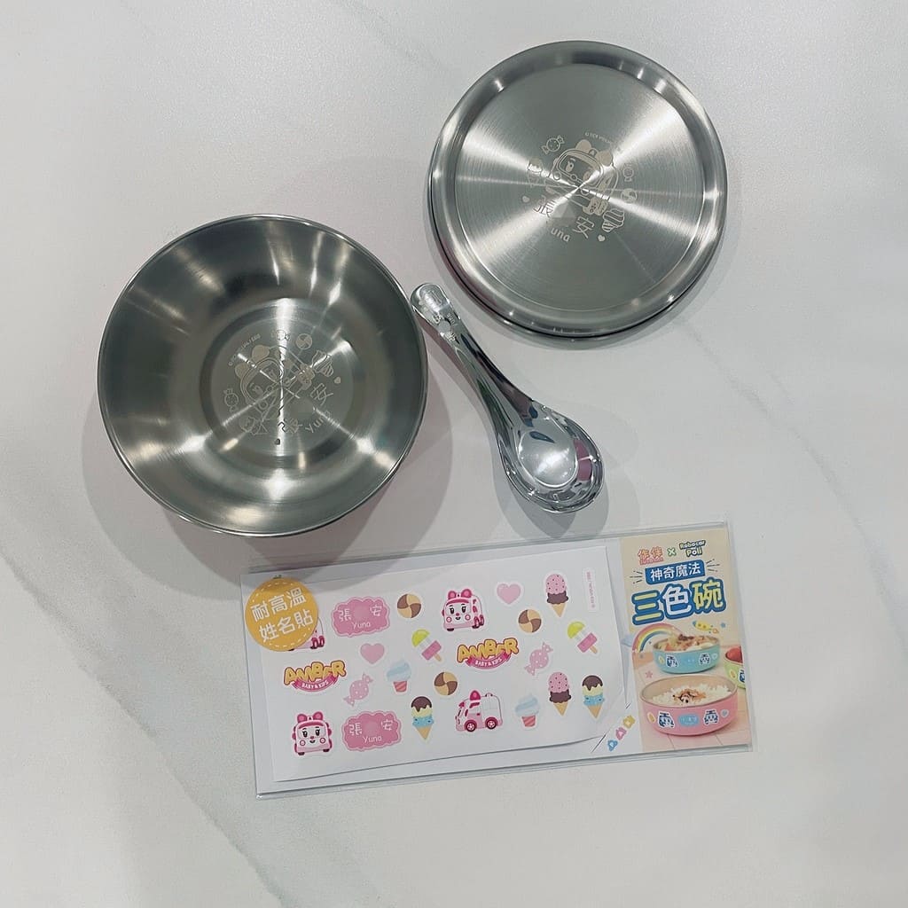 然後,我要聊聊『不鏽鋼三色碗』。每一個都包括了一個可愛的不鏽鋼碗和一把配套的湯匙還有耐高溫貼紙!
