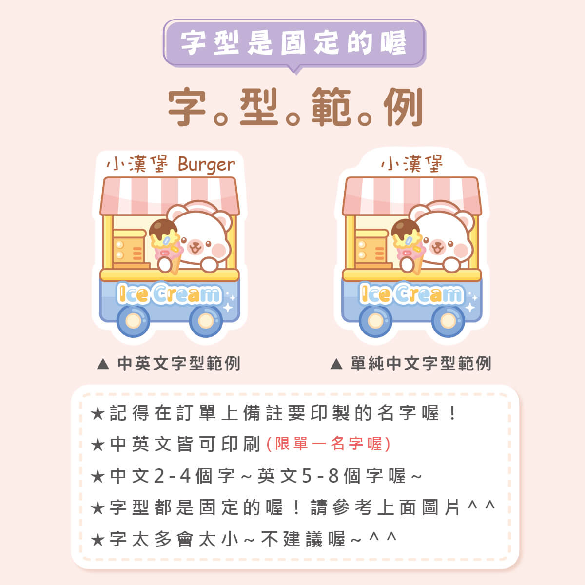 1. 姓名貼會依照訂單填寫內容製作,姓名部份不再另外做確認,請務必確認填寫內容是否正確