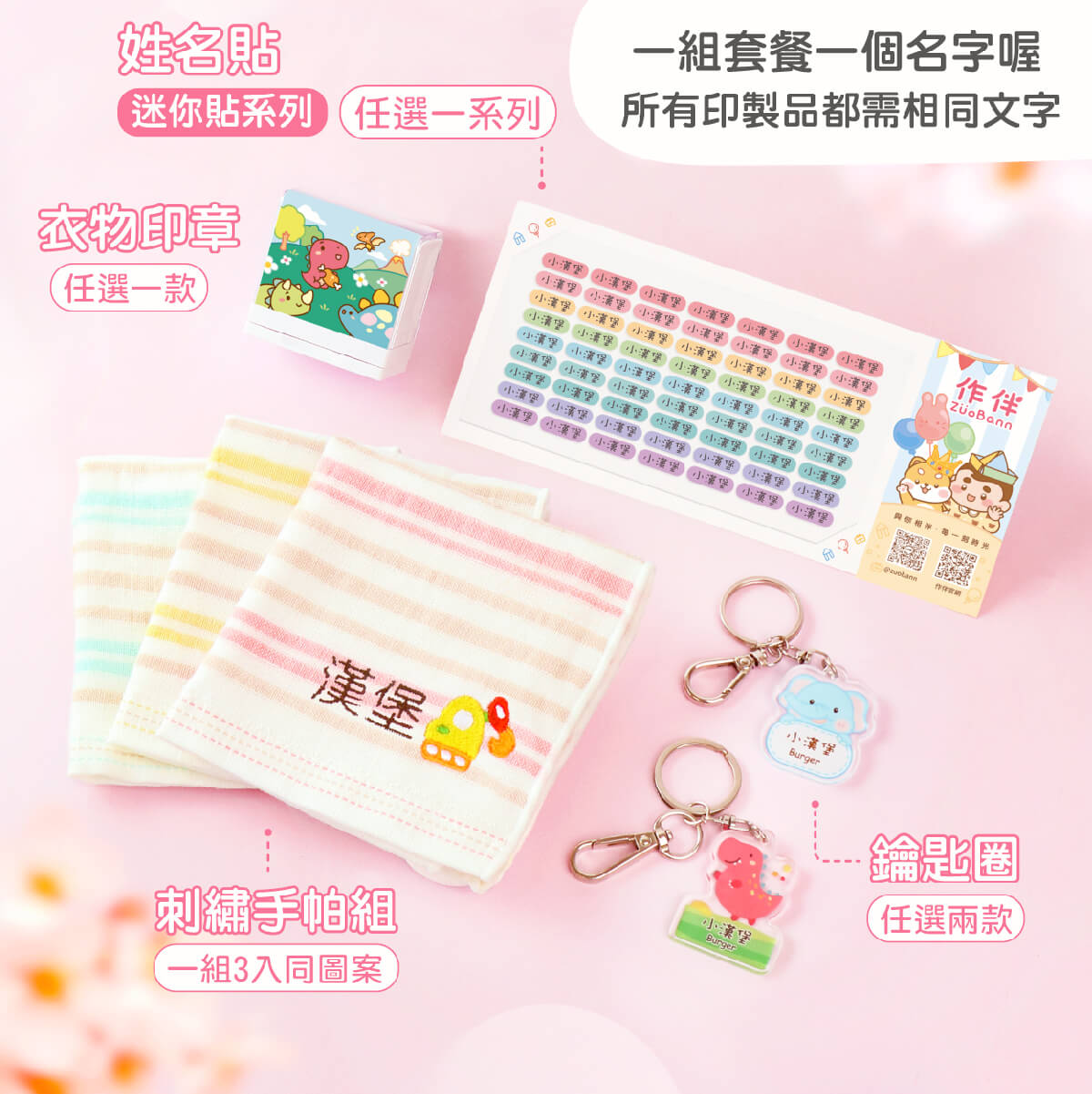高級防水迷你姓名貼+印章+鑰匙圈2入+刺繡手帕巾3入