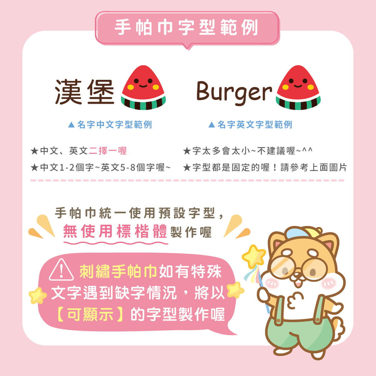 ▶ 手帕刺繡中英文二擇一,中文1-2個字,英文5-6個字喔