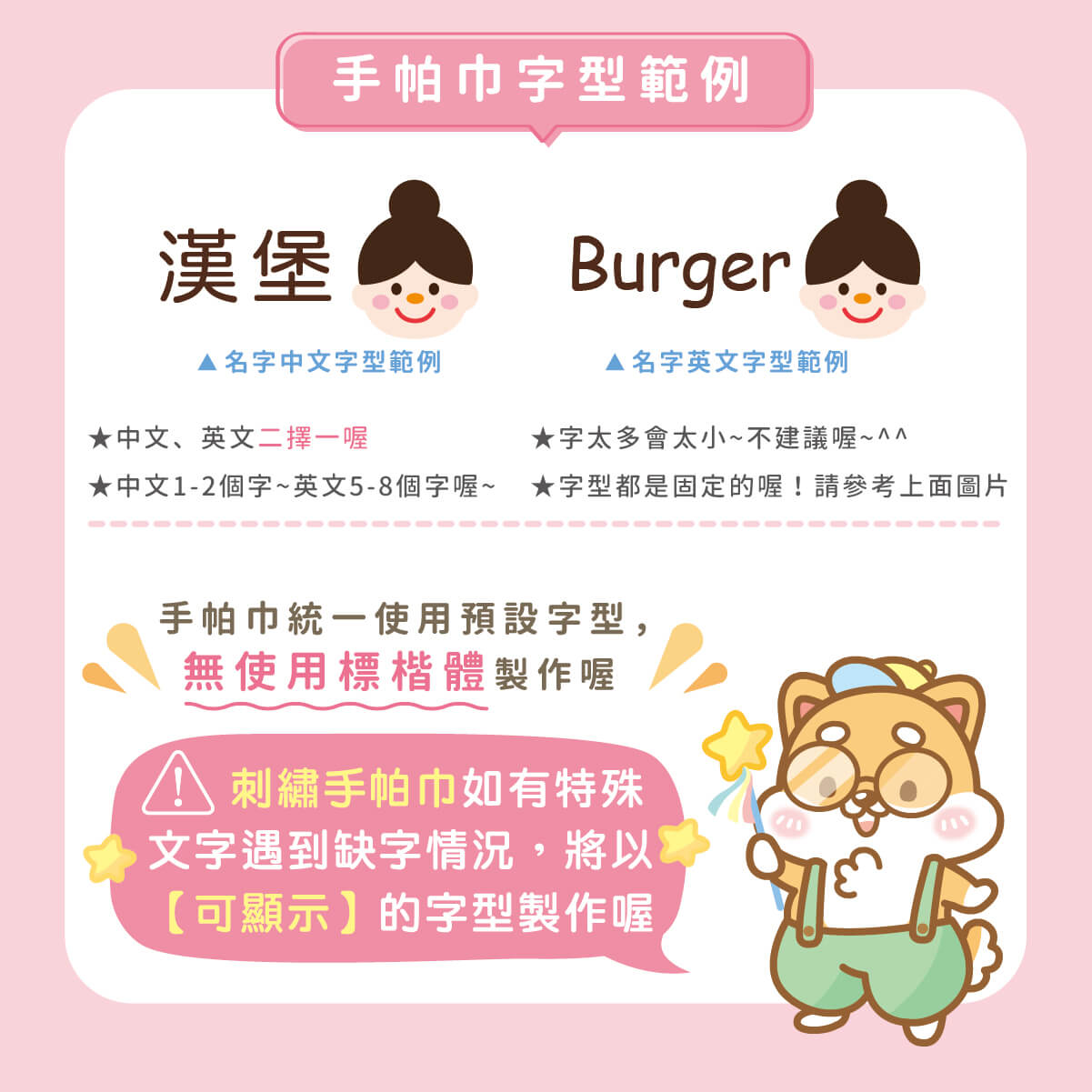 ▶ 手帕刺繡中英文二擇一,中文1-2個字,英文5-6個字喔