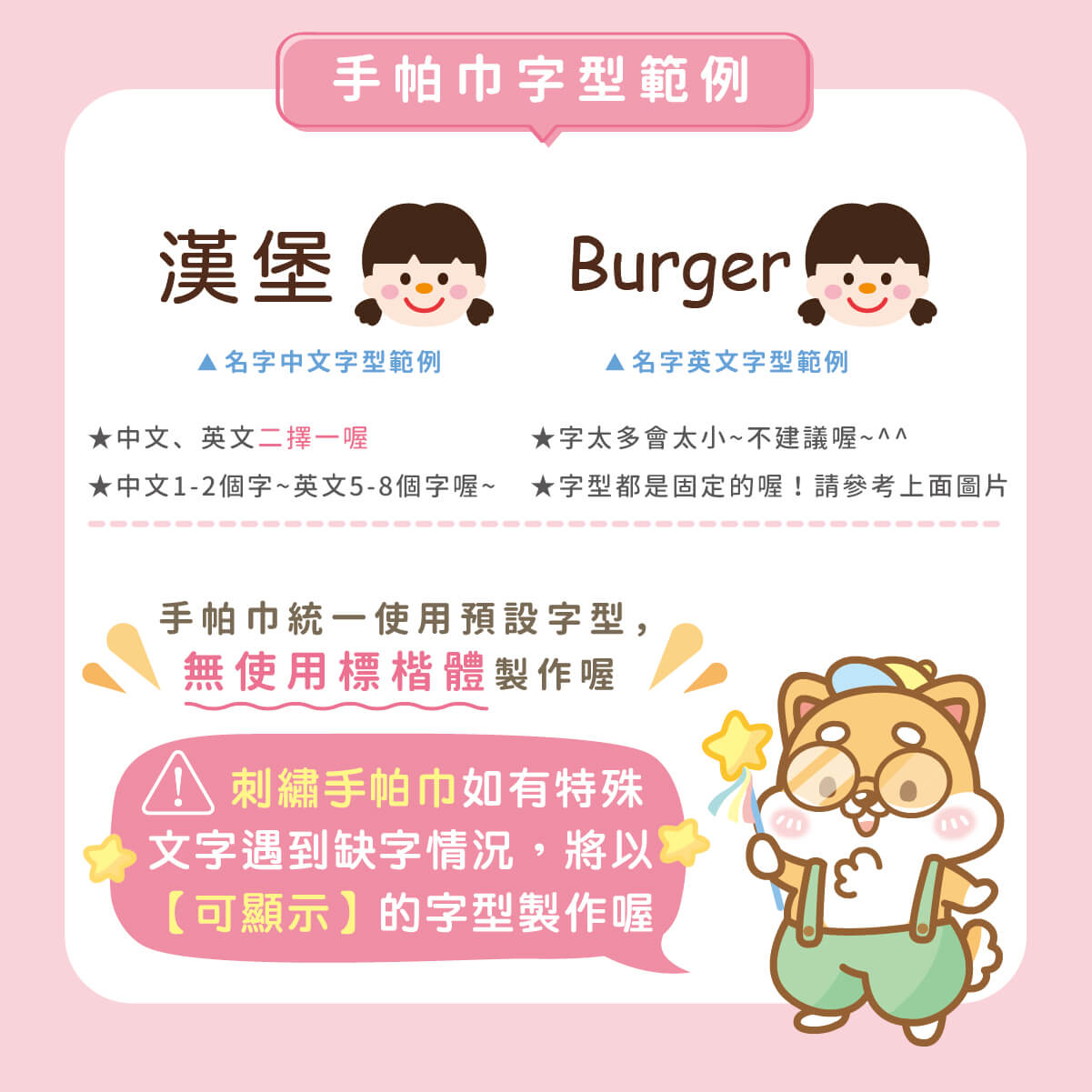 ▶ 手帕刺繡中英文二擇一,中文1-2個字,英文5-6個字喔