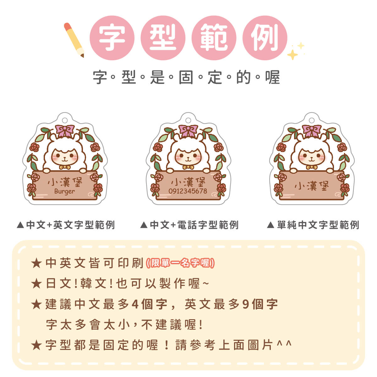 ▶ 字型都是固定的喔,如果想要中規中矩請備註要標楷體喔