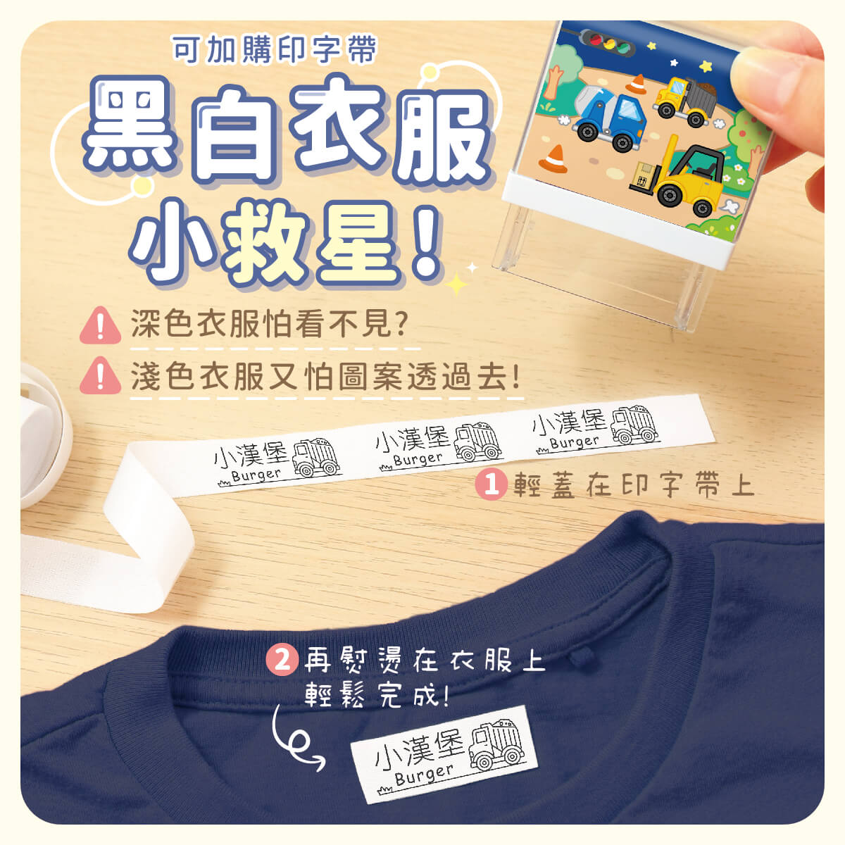 4. 印章墨水是黑色的,蓋印在淺色衣物有透印的可能,若是介意可使用印字帶燙印喔