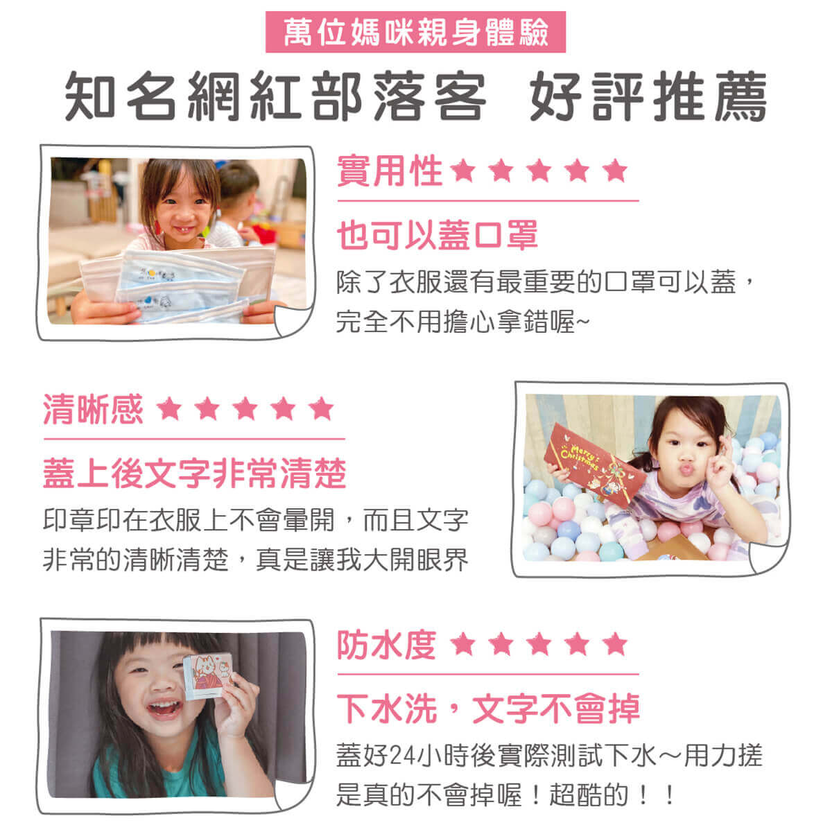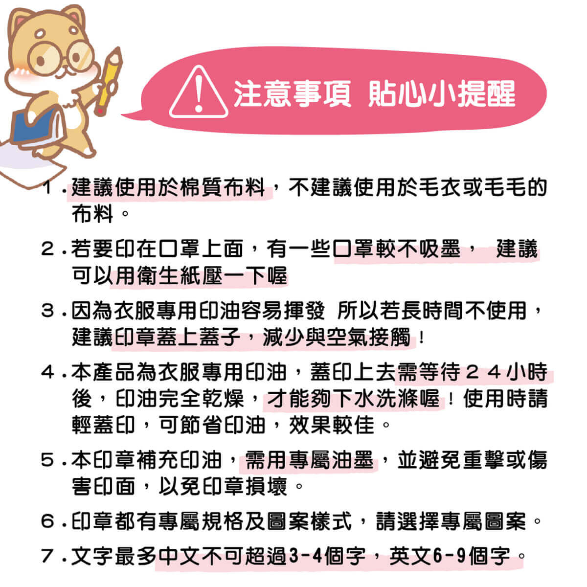 4. 印章墨水是黑色的,蓋印在淺色衣物有透印的可能,若是介意可使用印字帶燙印喔