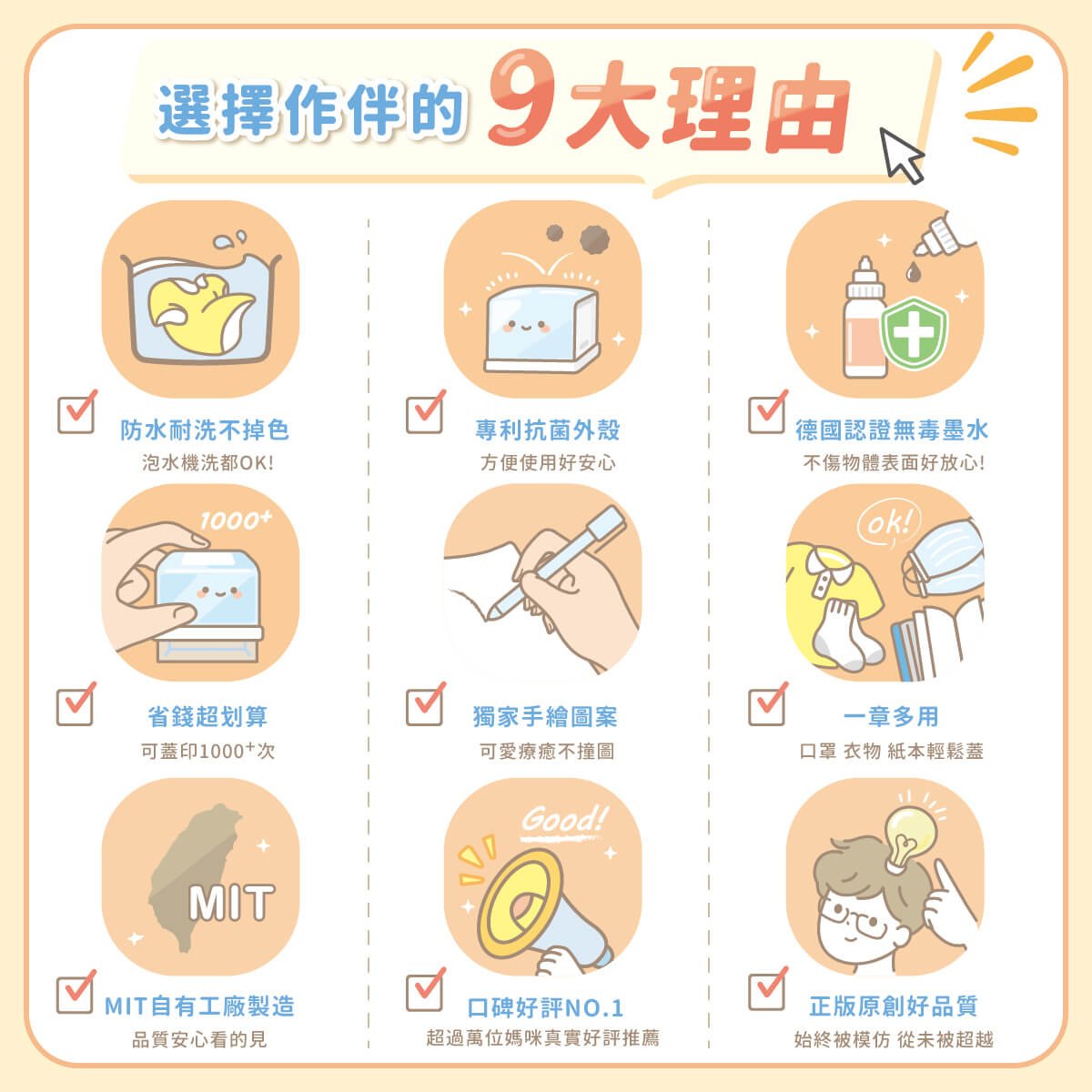 作伴衣物印章無毒抗菌、防水又耐洗,還擁有可愛彩色外殼