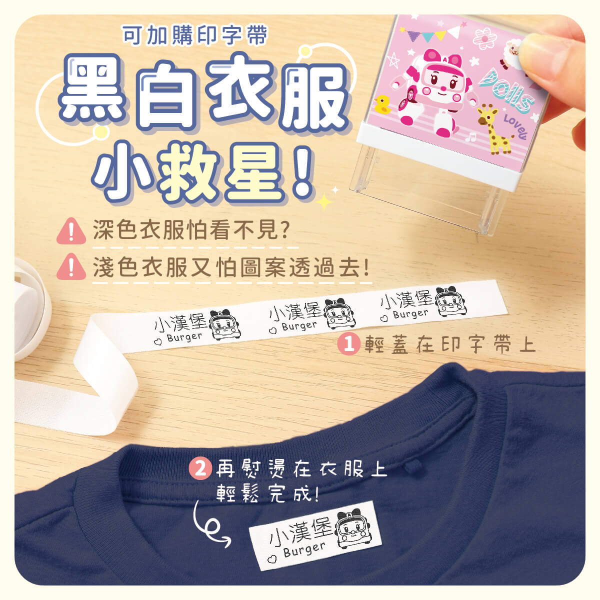4. 印章墨水是黑色的,蓋印在淺色衣物有透印的可能,若是介意可使用印字帶燙印喔
