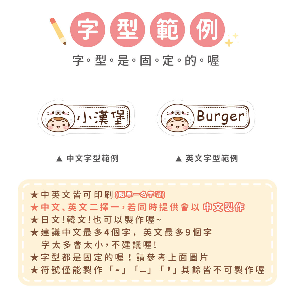 ▶ 此款姓名貼中英文二擇一,若無特別標示會以中文為主喔