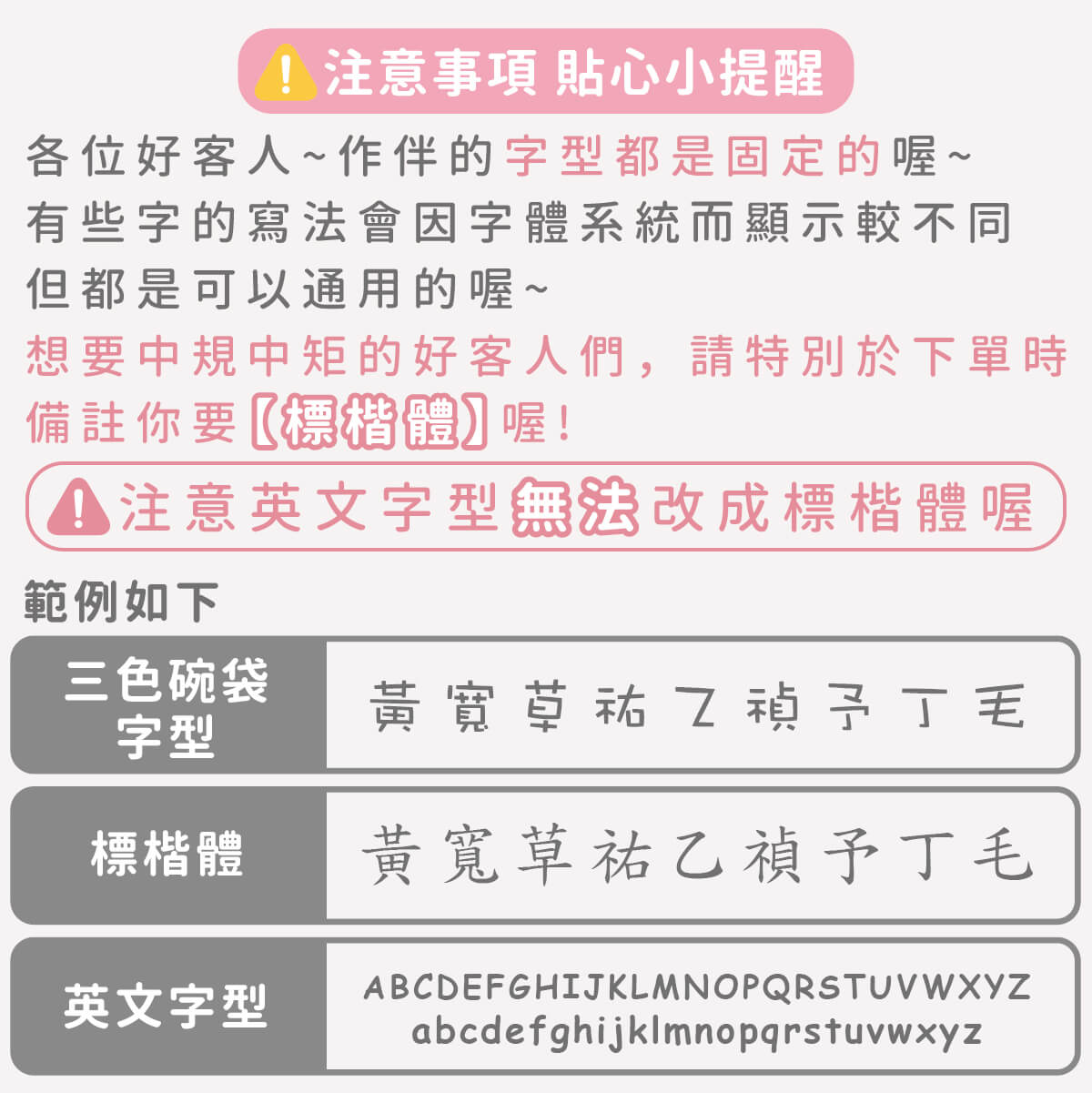 ▶ 字型都是固定的喔,如果想要中規中矩請備註要標楷體喔