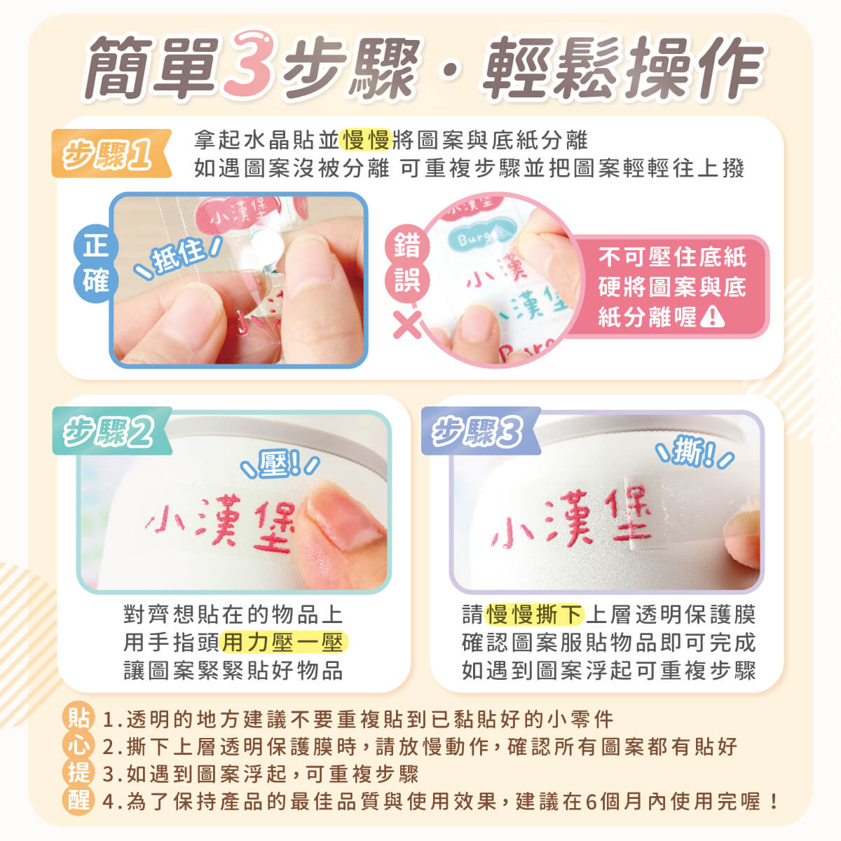 3. 如有髒污及不平整會影響其黏貼效果,撕與貼的時候請小心慢慢使用,動作太快貼紙會容易脫落喔!