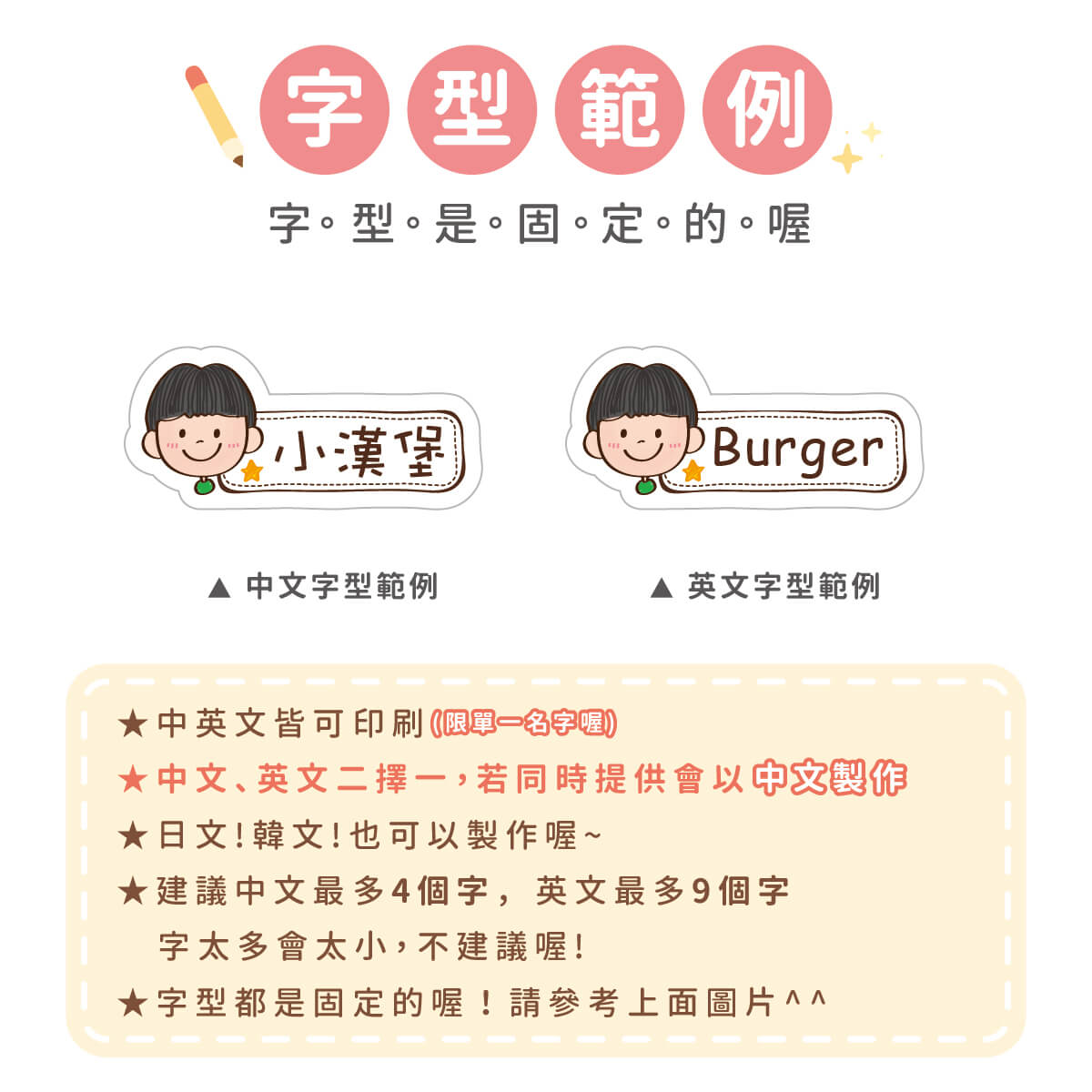 ▶ 此款姓名貼中英文二擇一,若無特別標示會以中文為主喔