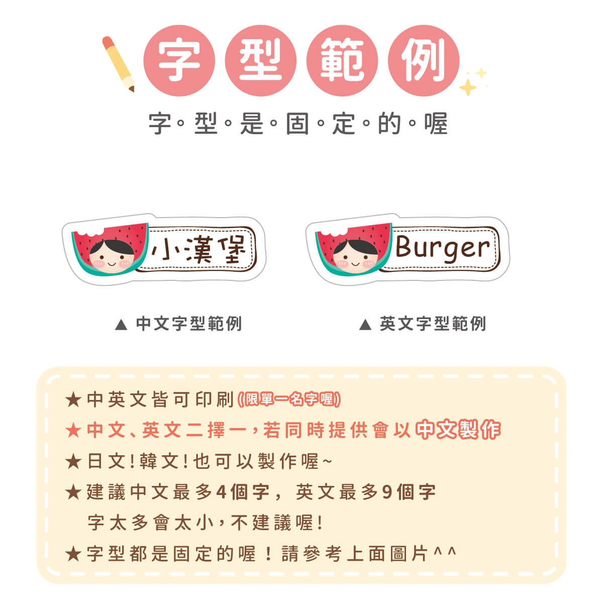 1. 姓名貼會依照訂單填寫內容製作,姓名部份不再另外做確認,請務必確認填寫內容是否正確