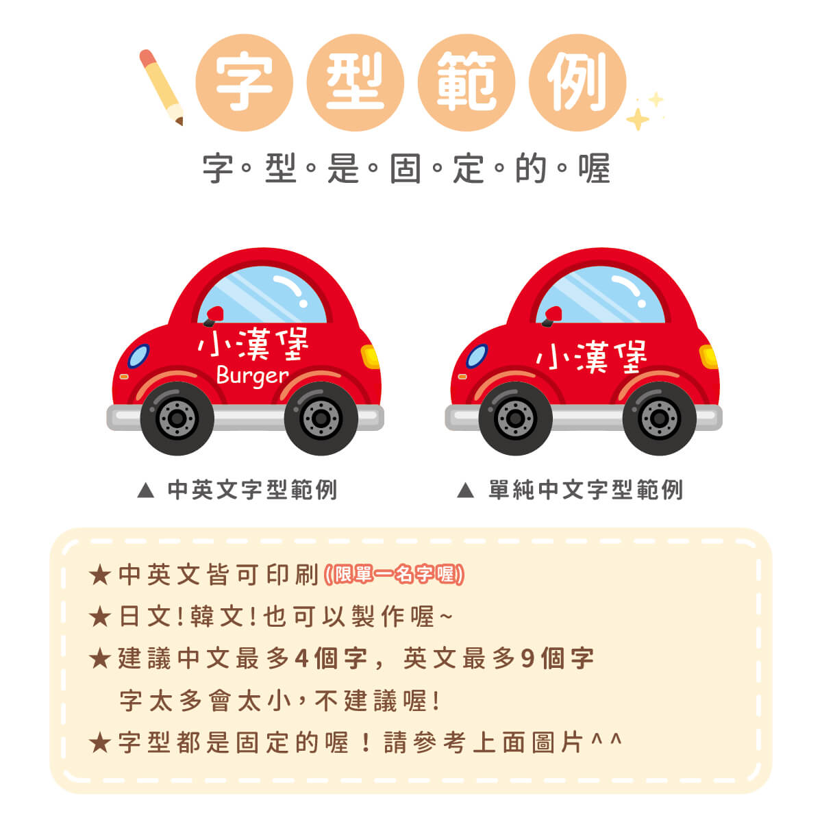 ▶ 字型都是固定的喔,如果想要中規中矩請備註要標楷體喔