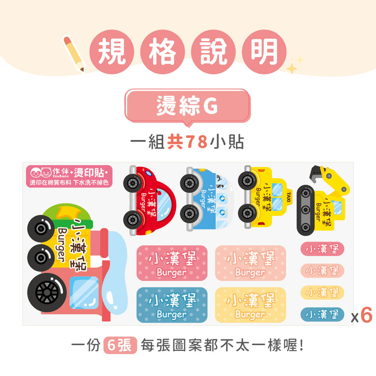一組6張,每張皆含不同尺寸與圖案,共78入