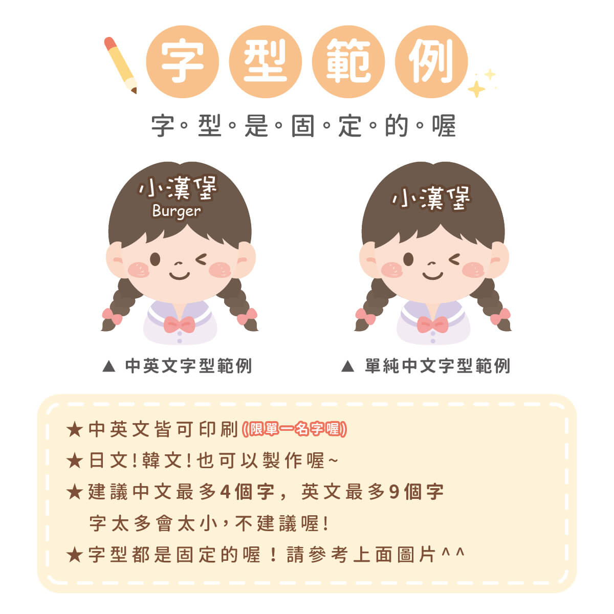 ▶ 字型都是固定的喔,如果想要中規中矩請備註要標楷體喔