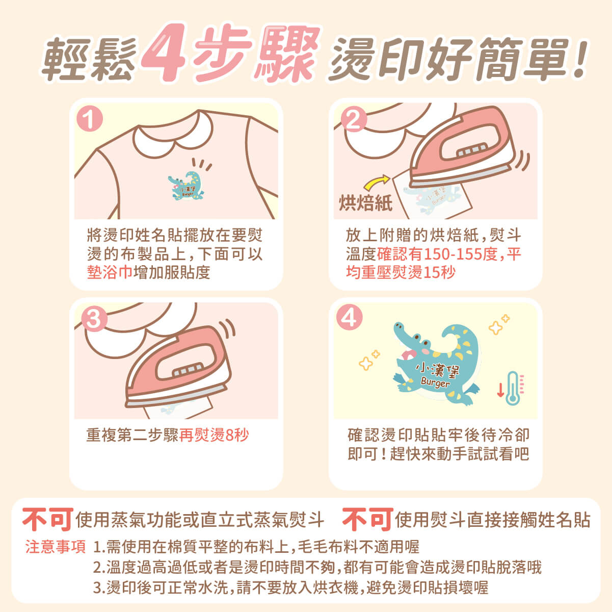 3. 燙印貼"不可"用熨斗直接接觸姓名貼。