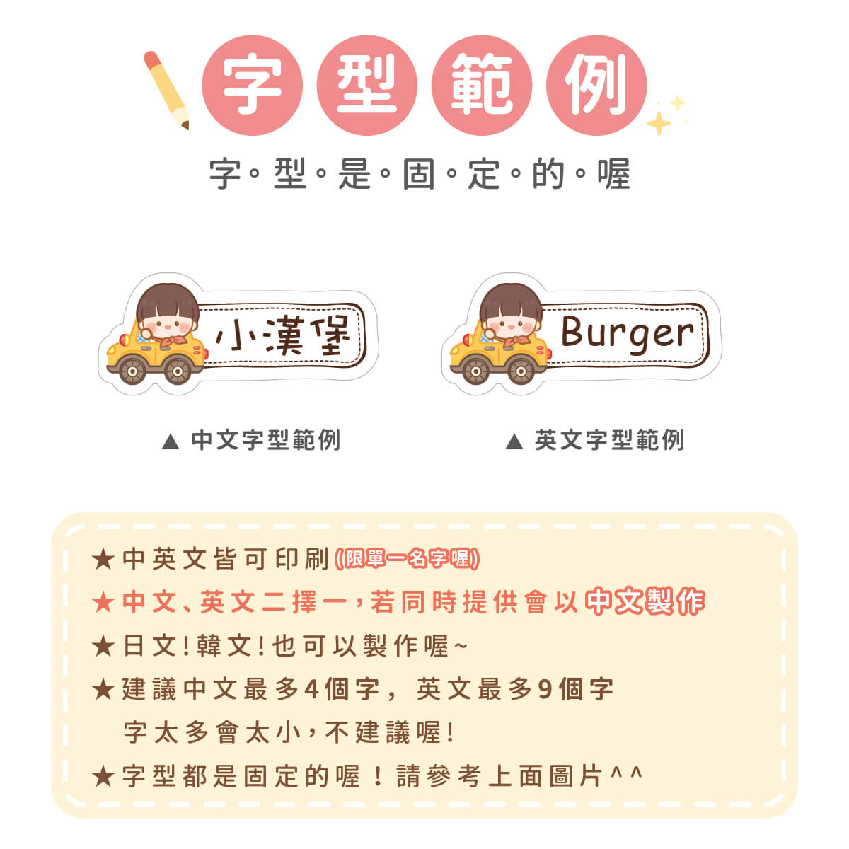 1. 姓名貼會依照訂單填寫內容製作,姓名部份不再另外做確認,請務必確認填寫內容是否正確