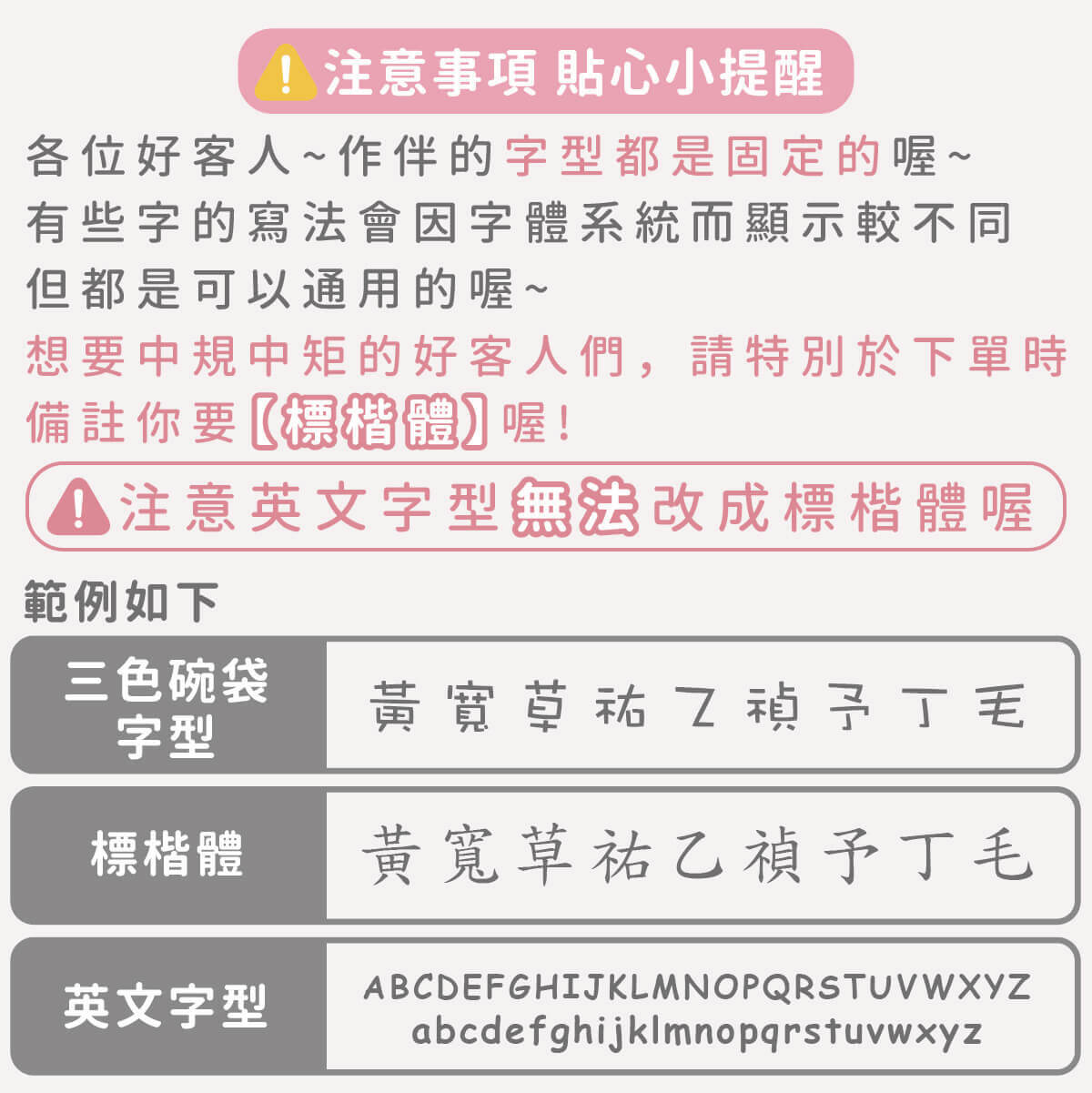 ▶ 字型都是固定的喔,如果想要中規中矩請備註要標楷體喔