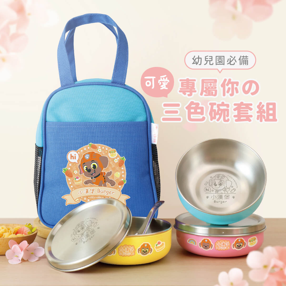 內容物:湯匙三入,碗三種顏色(甜心粉/天空藍/月亮黃)各一,共三入,碗袋一入