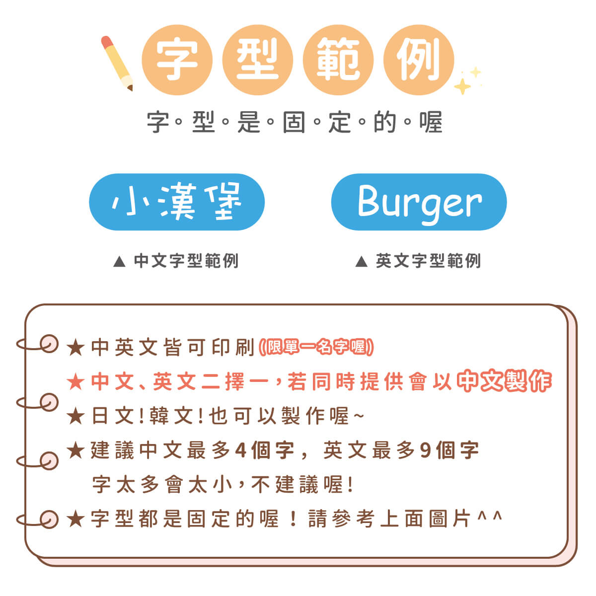 ▶ 字型都是固定的喔,如果想要中規中矩請備註要標楷體喔