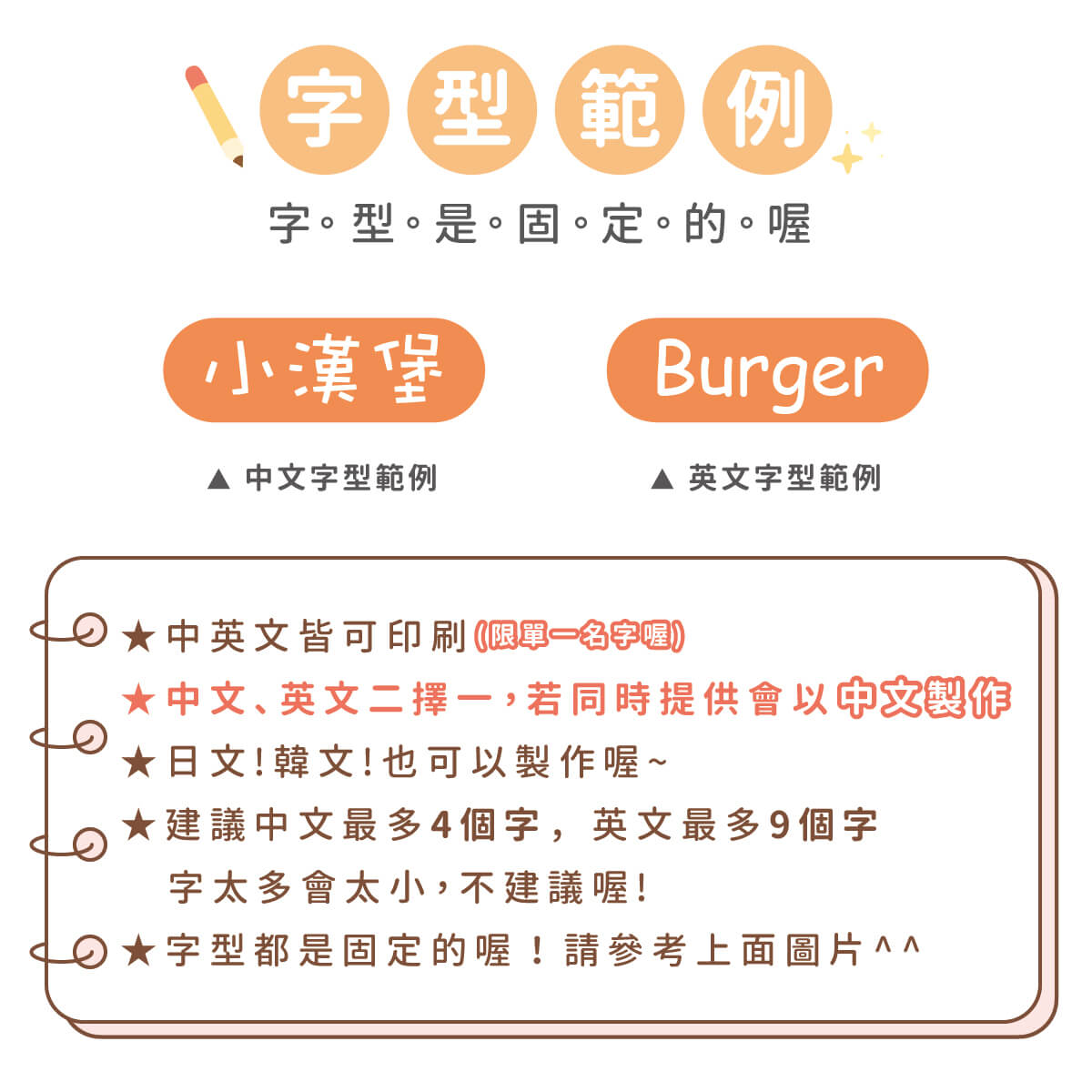 ▶ 字型都是固定的喔,如果想要中規中矩請備註要標楷體喔