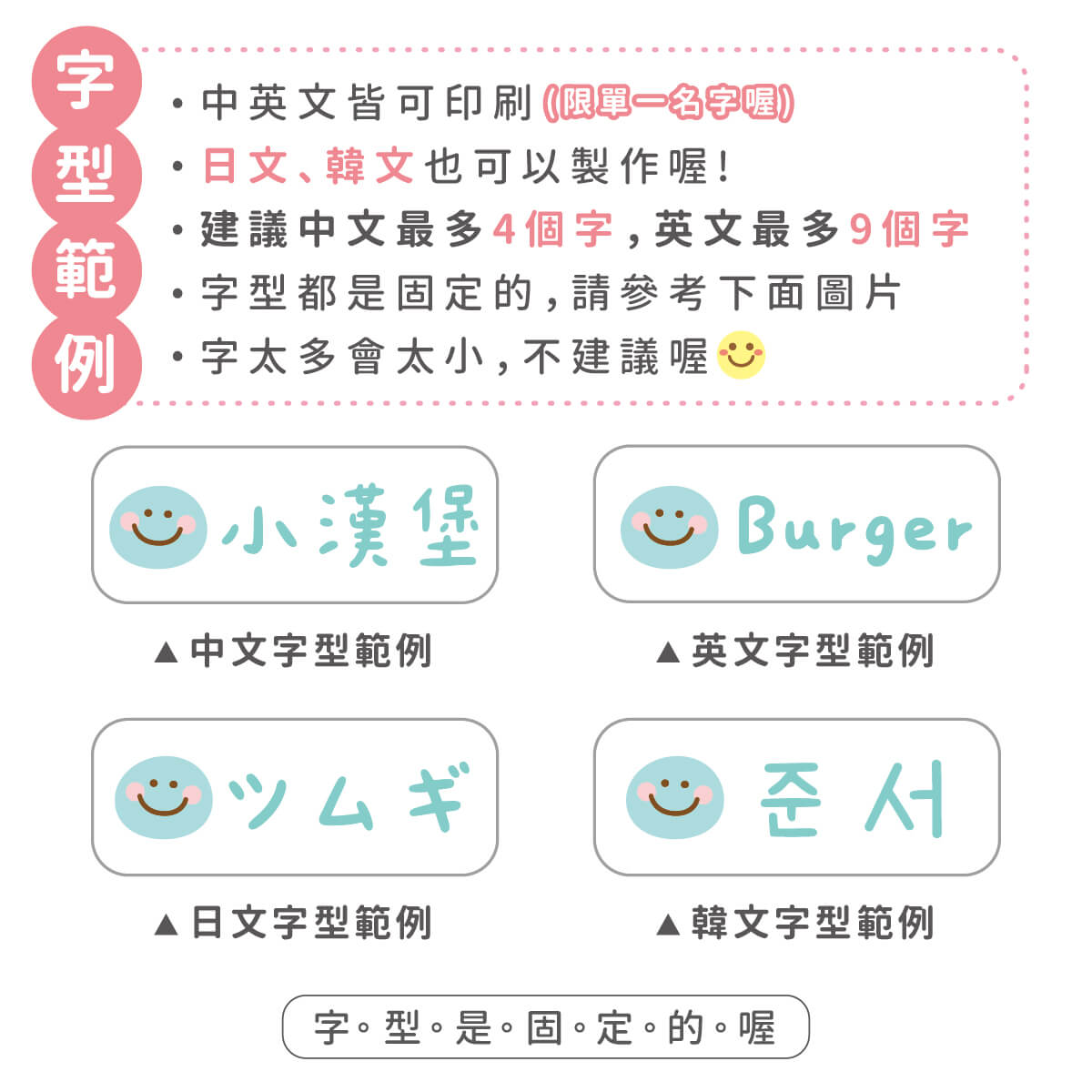 1. 姓名貼會依照訂單填寫內容製作,姓名部份不再另外做確認,請務必確認填寫內容是否正確