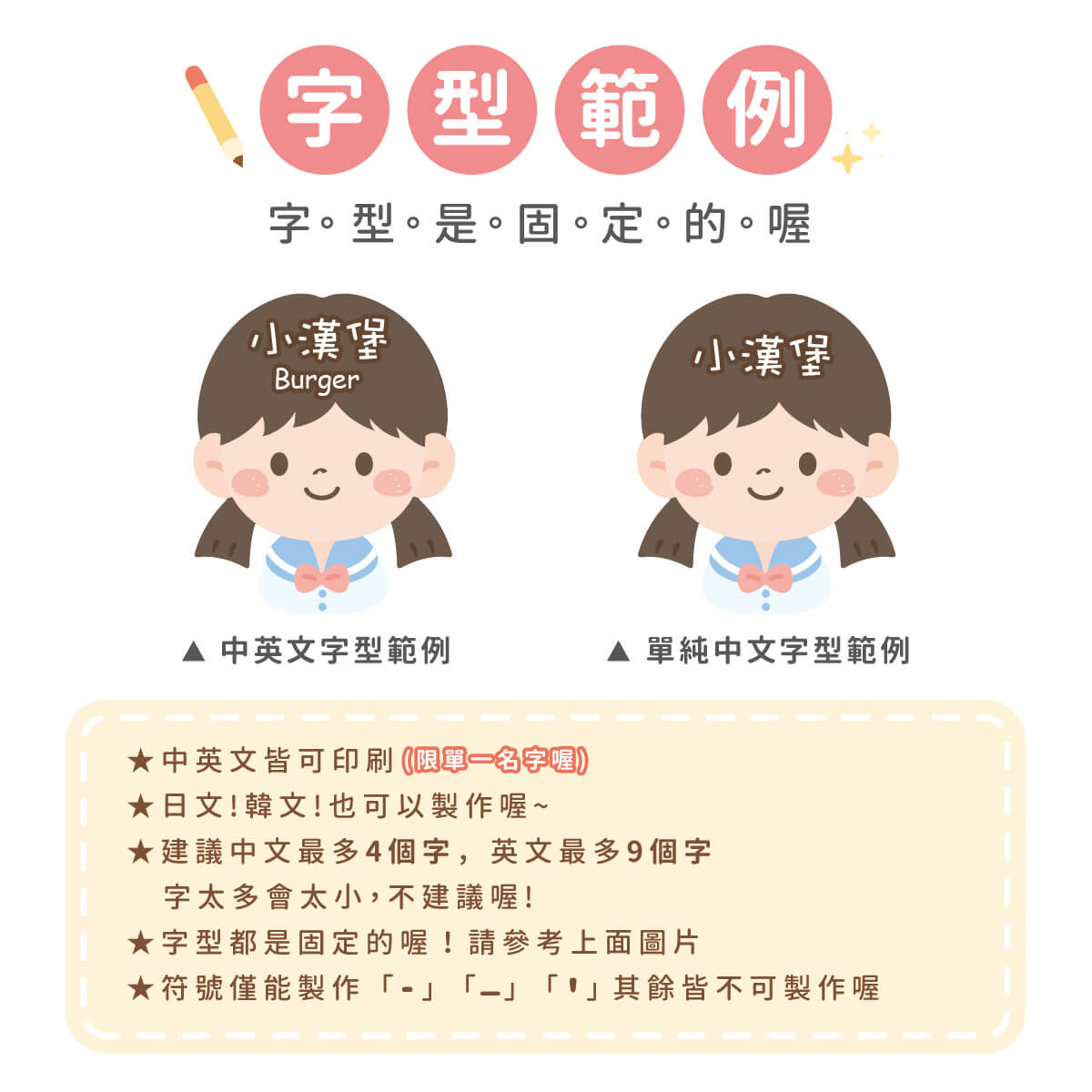▶ 字型都是固定的喔,如果想要中規中矩請備註要標楷體喔