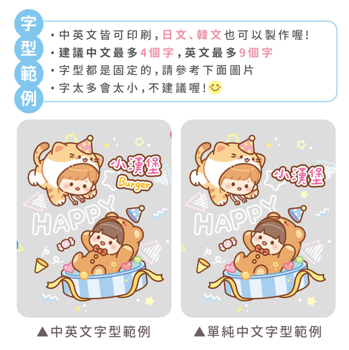 文字部分會依照訂單填寫內容製作,不再另外做確認,請務必確認填寫內容是否正確