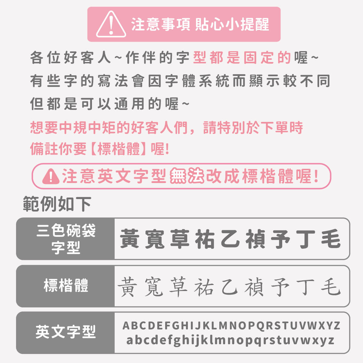 ▶ 字型都是固定的喔,如果想要中規中矩請備註要標楷體喔