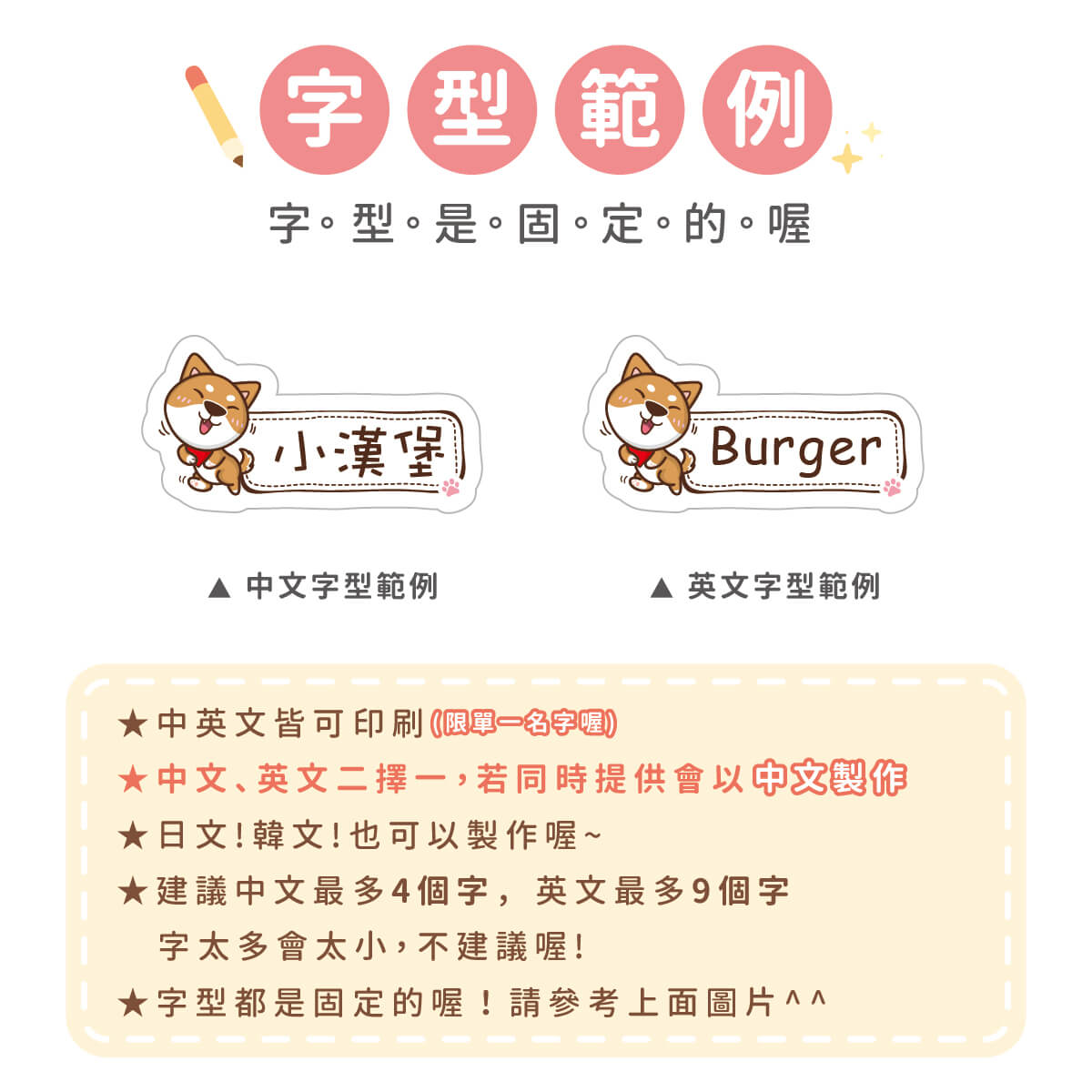 1. 姓名貼會依照訂單填寫內容製作,姓名部份不再另外做確認,請務必確認填寫內容是否正確