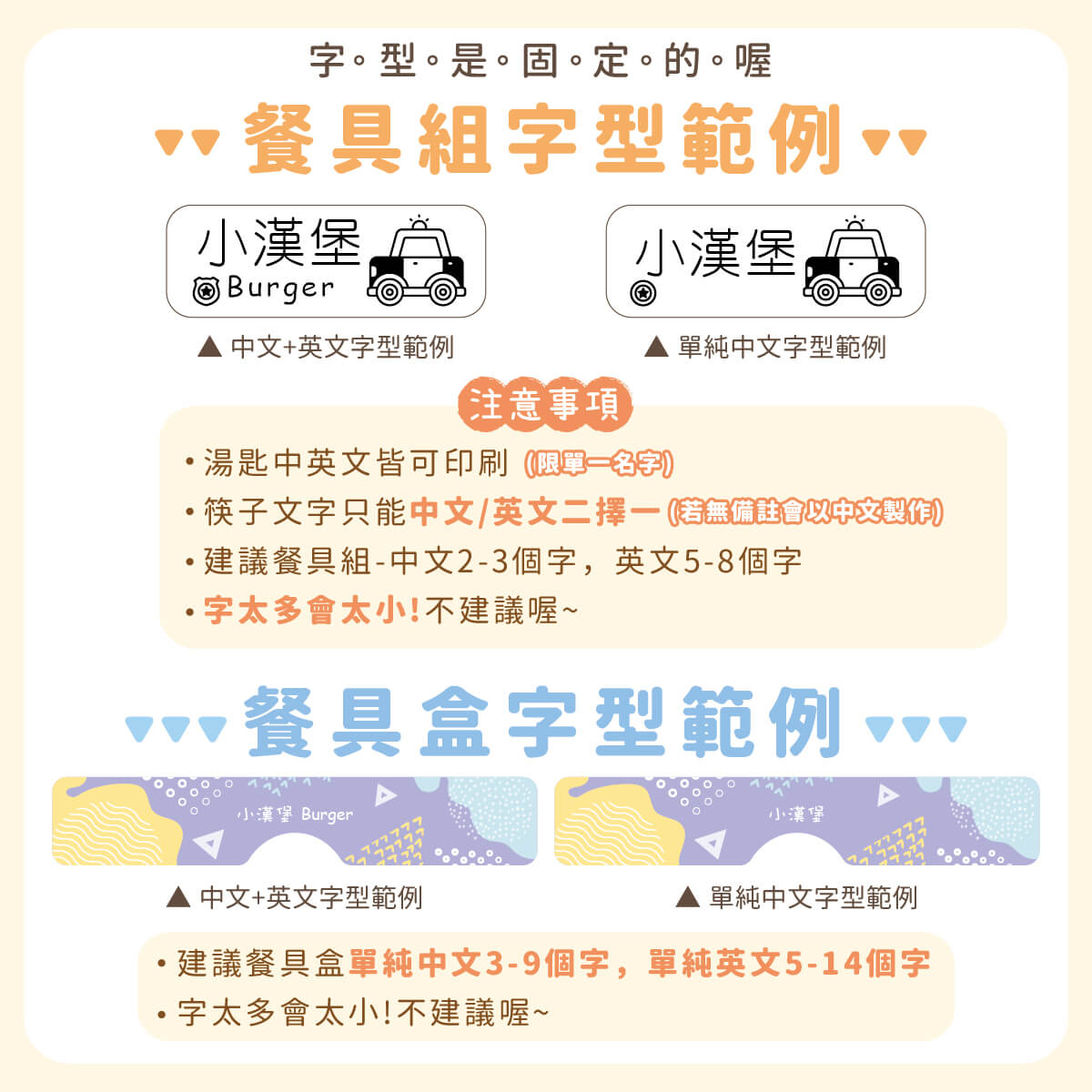 ▶ 餐具組的湯匙可中英文一起,筷子中英文二擇一