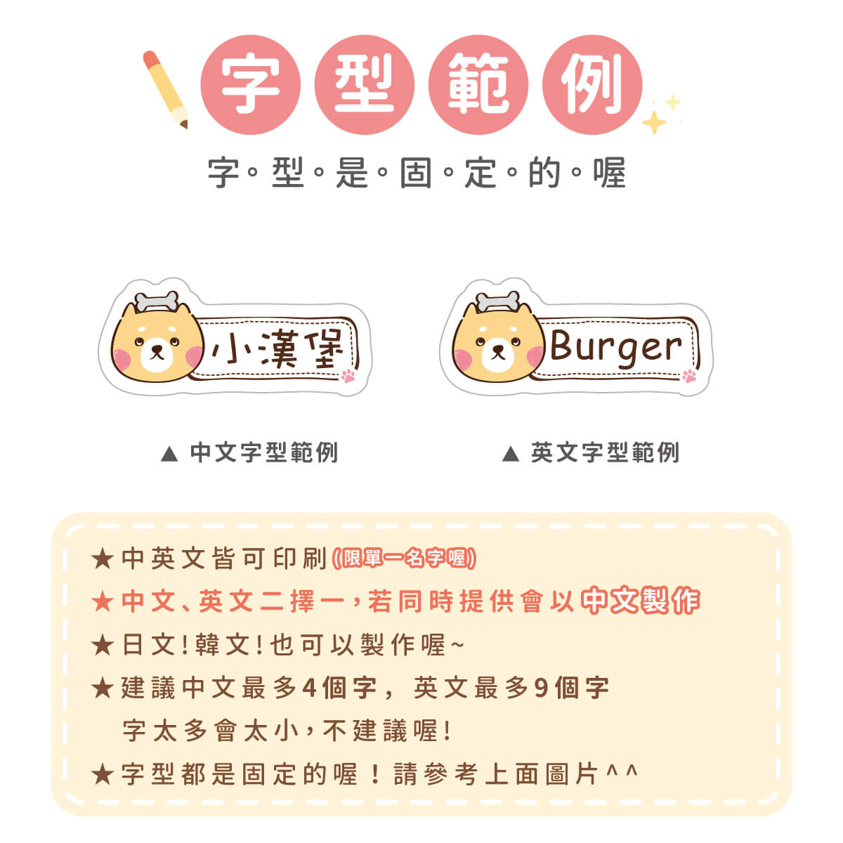 1. 姓名貼會依照訂單填寫內容製作,姓名部份不再另外做確認,請務必確認填寫內容是否正確