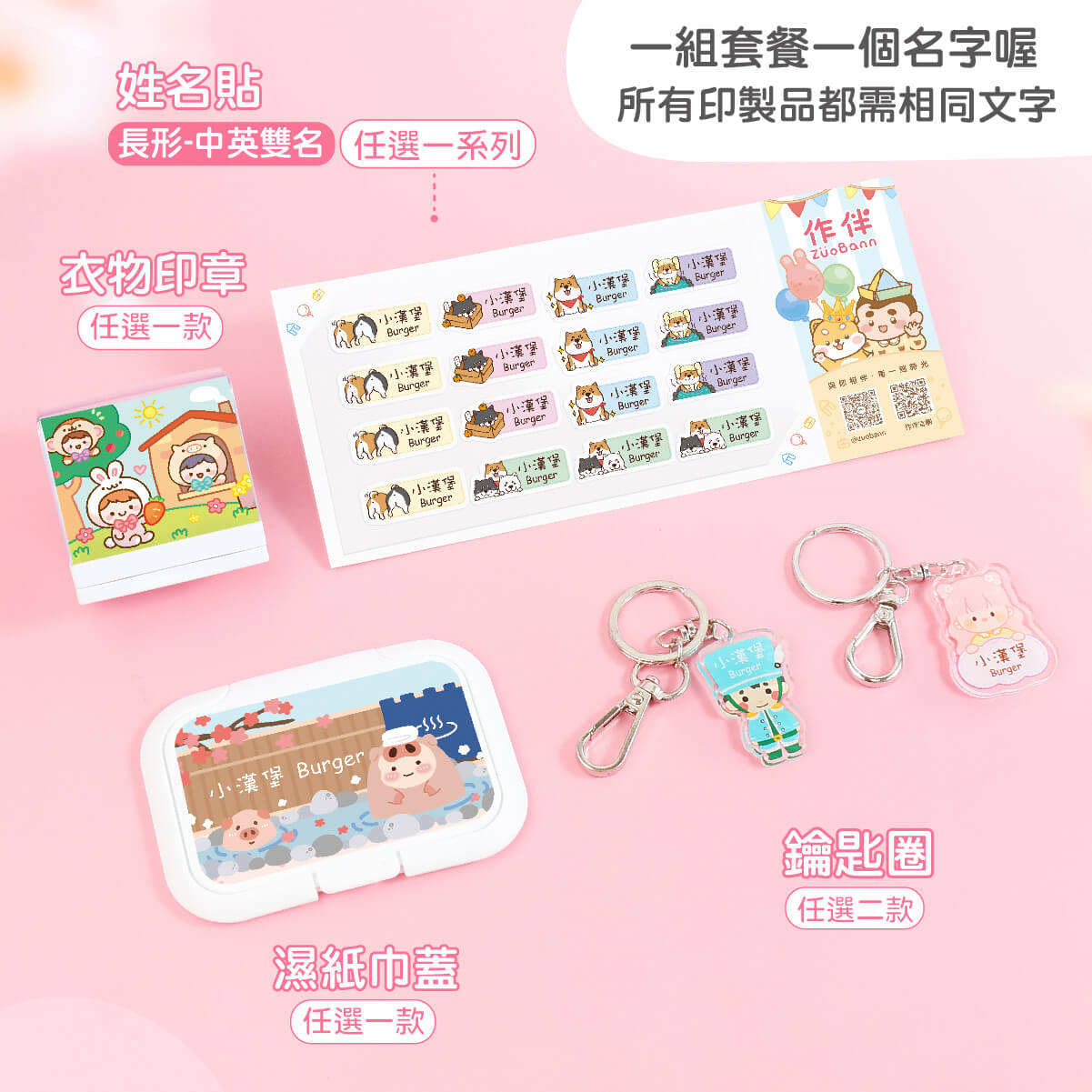 高級防水姓名貼中英雙名(方形)+衣物印章+鑰匙圈2入+溼紙巾蓋1入