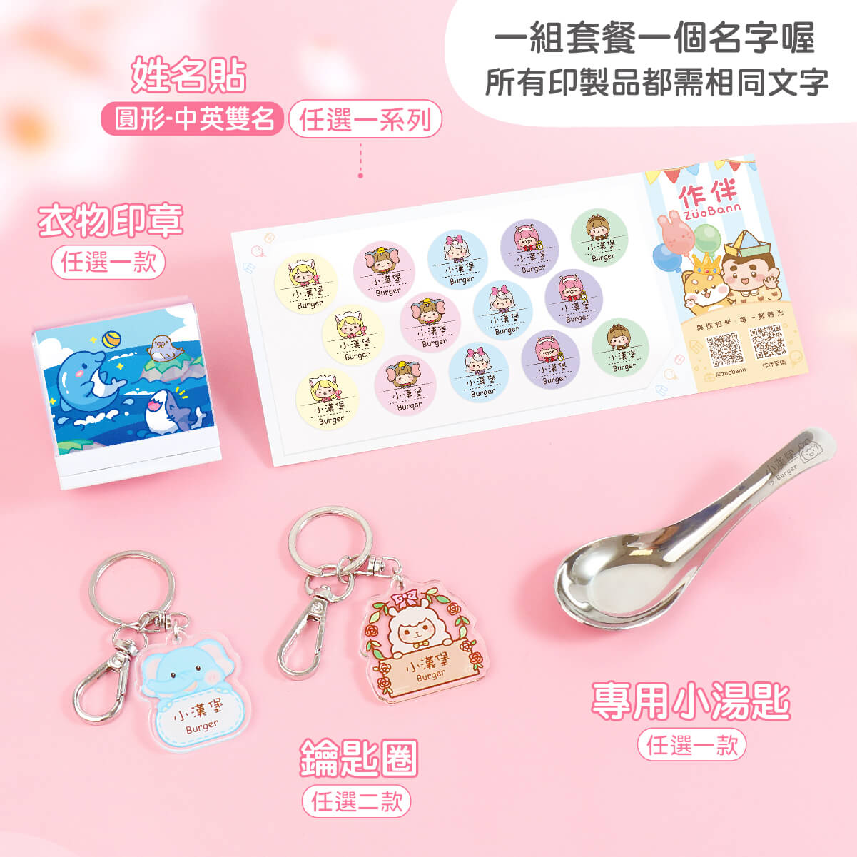 高級防水姓名貼中英雙名(圓形)+衣物印章+鑰匙圈2入+專用小湯匙1入