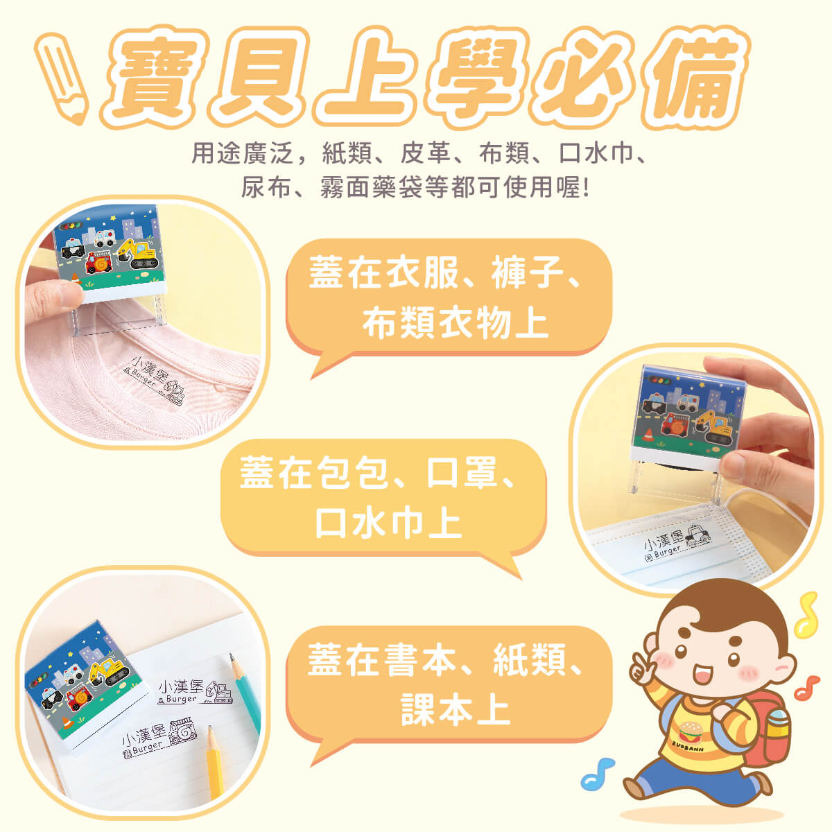 ▶ 印章墨水是黑色的,蓋印在淺色衣物有透印的可能,若是介意可使用印字帶燙印喔