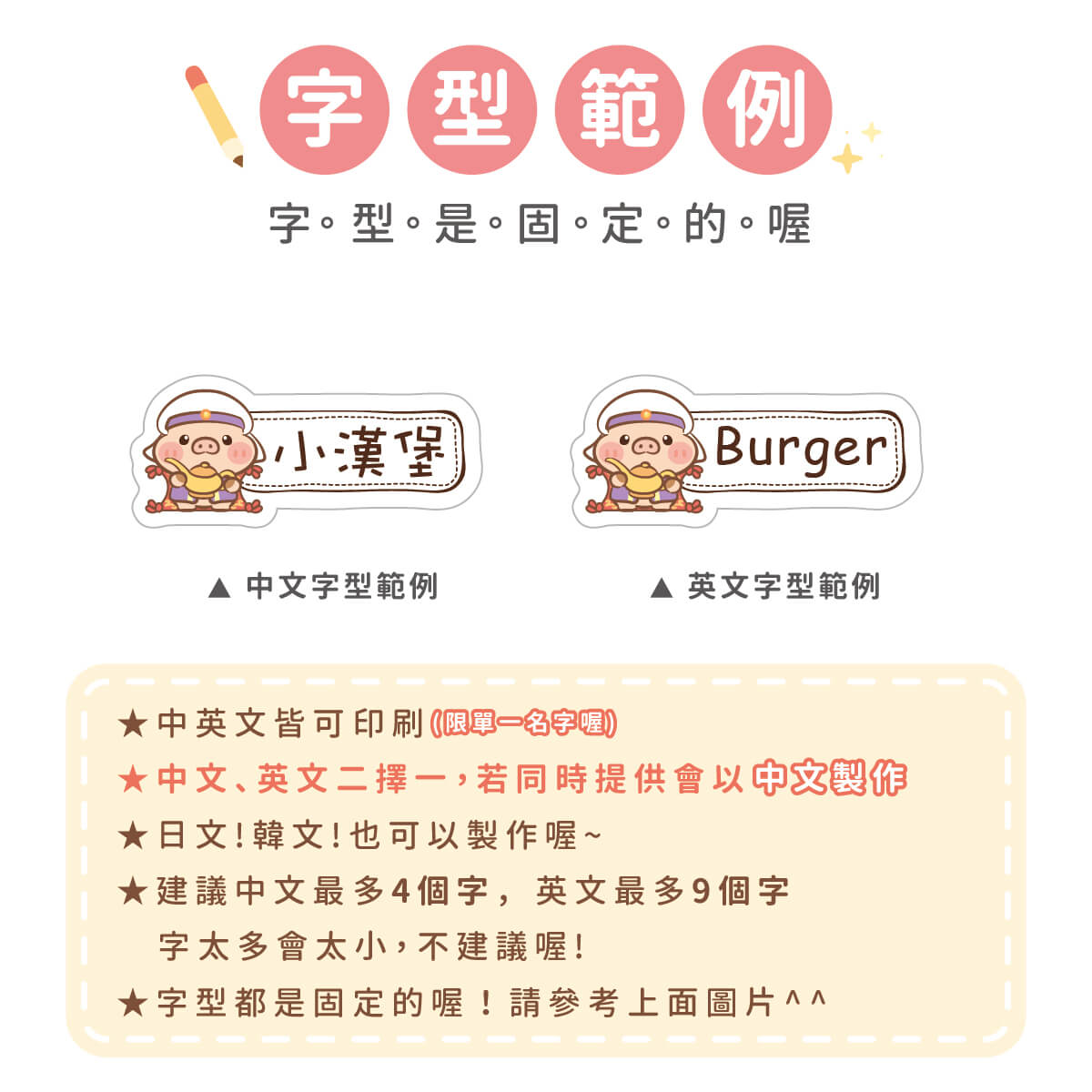 1. 姓名貼會依照訂單填寫內容製作,姓名部份不再另外做確認,請務必確認填寫內容是否正確