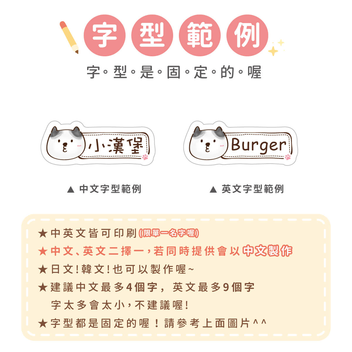 1. 姓名貼會依照訂單填寫內容製作,姓名部份不再另外做確認,請務必確認填寫內容是否正確