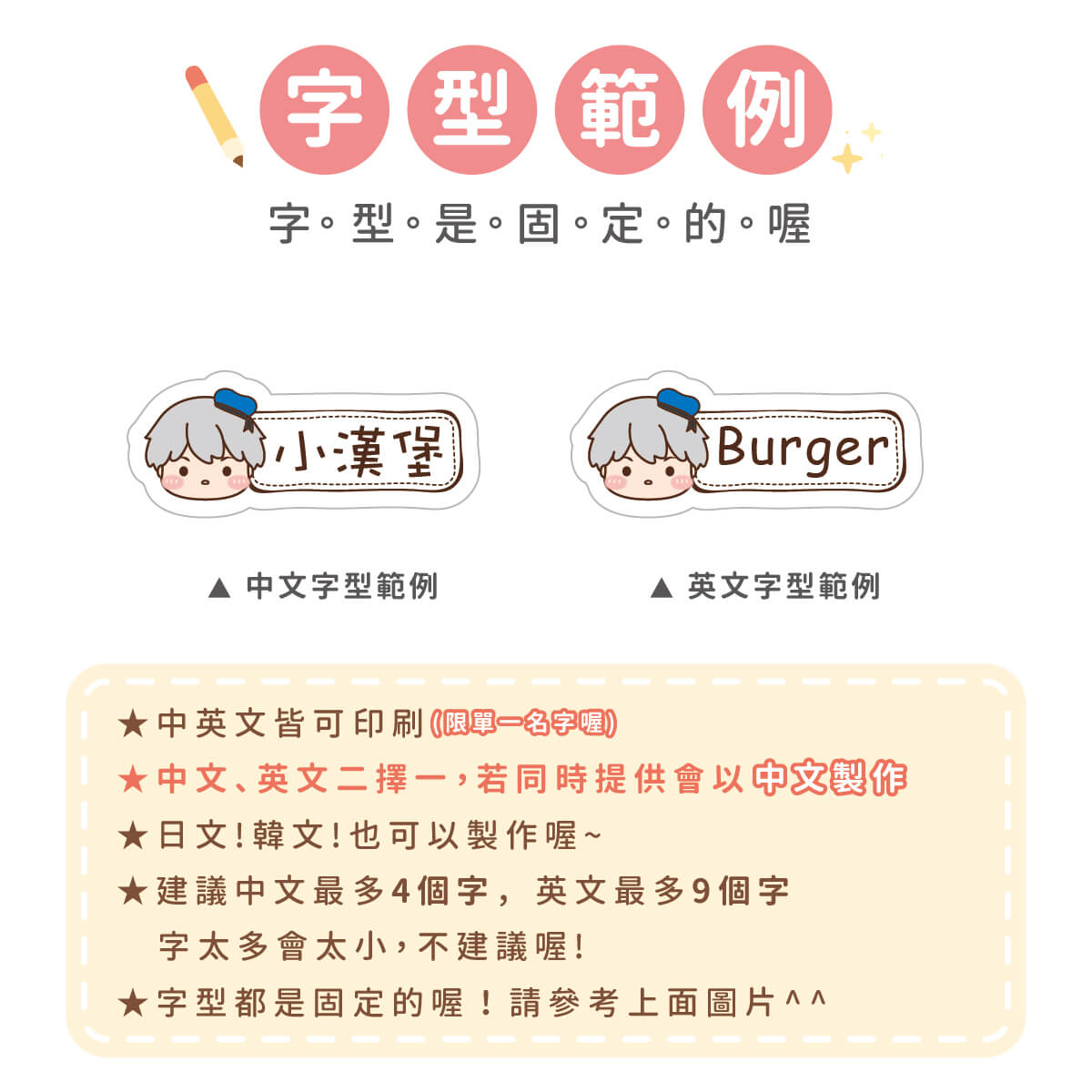 1. 姓名貼會依照訂單填寫內容製作,姓名部份不再另外做確認,請務必確認填寫內容是否正確