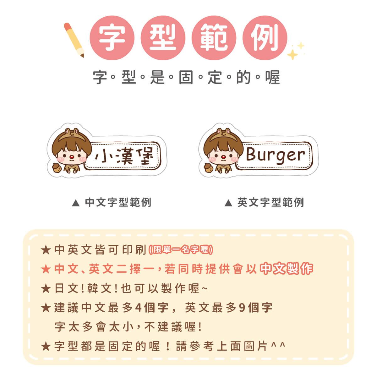 1. 姓名貼會依照訂單填寫內容製作,姓名部份不再另外做確認,請務必確認填寫內容是否正確