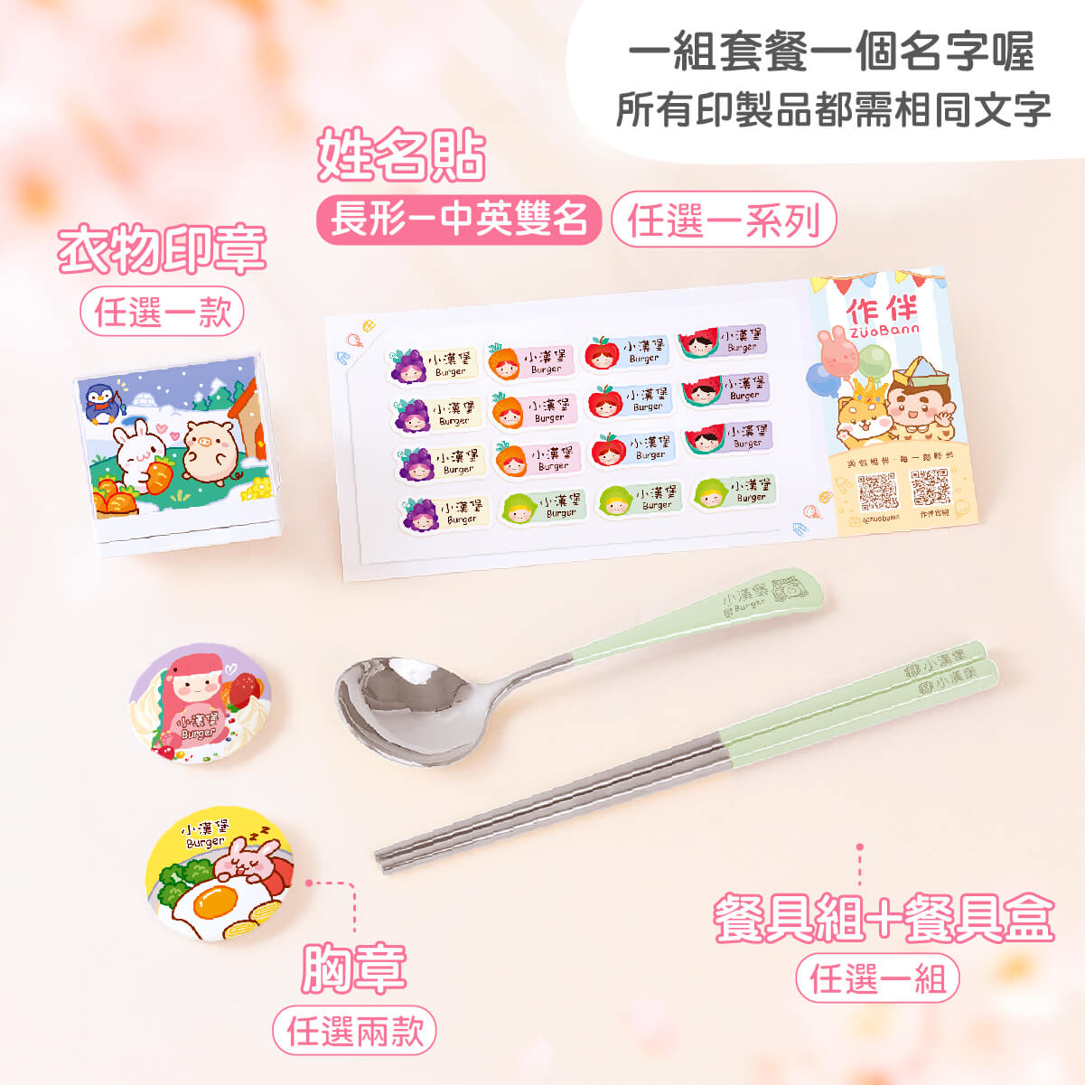 高級防水姓名貼中英雙名長形+衣物印章+餐具組+胸章2入