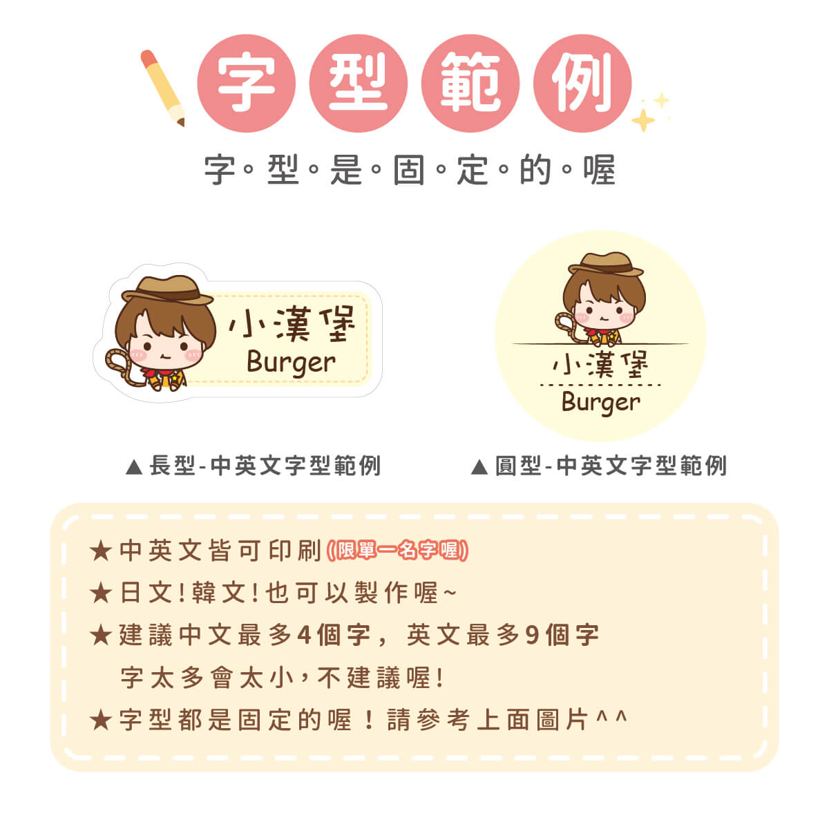 1. 姓名貼會依照訂單填寫內容製作,姓名部份不再另外做確認,請務必確認填寫內容是否正確